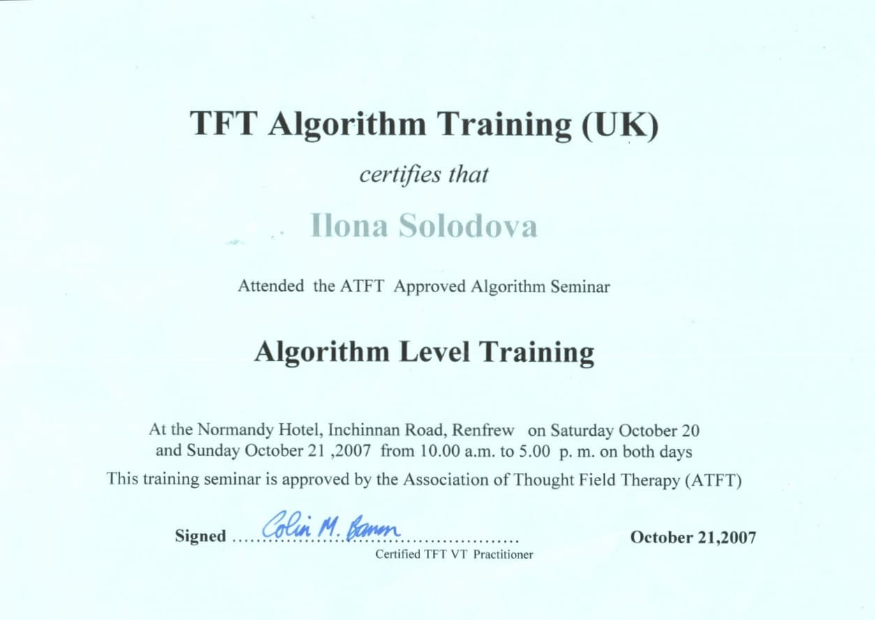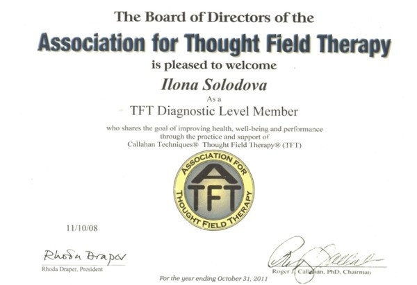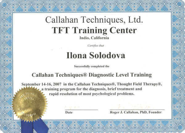 Единственный в русскоязычном мировом пространстве Сертифицированный тренер по технологии "Мыслеполе", ученица Р. Каллахана - основателя технологии.